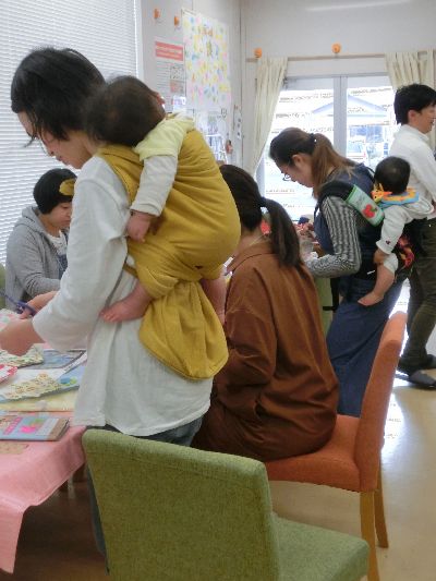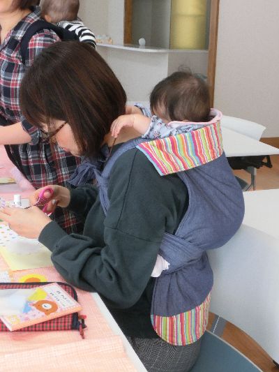 「ちくちくのへや」の出張講座にご参加いただく赤ちゃんとママには、作業の際は必ずおんぶで参加をお願いしています。